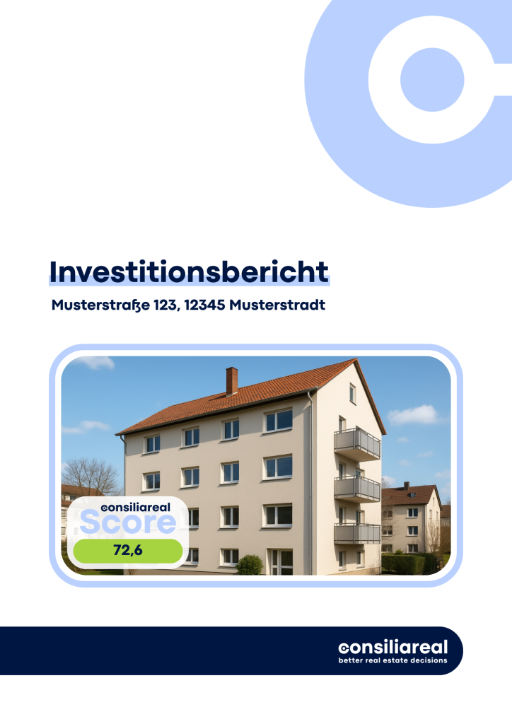 Aus diesen Ergebnissen entsteht der consiliareal-Score, der die Stärken und Schwächen des Objekts transparent aufzeigt. Grundlage ist ein unabhängiger Investitionsbericht, in dem die einzelnen Bereiche detailliert erläutert werden – inklusive Handlungsempfehlungen und übersichtlicher Aufbereitung aller relevanten Objektdaten. Ergänzend dazu enthält jeder Investitionsbericht einen Red Flag Report.